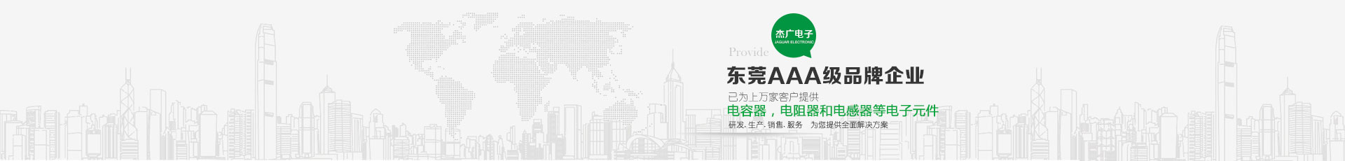 東莞市杰廣電子有限公司是一電子元件之專業制造廠 ,銷售遍及世界各地,主要產品包括:電容器,電阻器和電感器等電子元件,以供應汽車,通訊,電腦,音響,影像,電動工具,儀表,以及軍用電子等工業之電子元件使用。